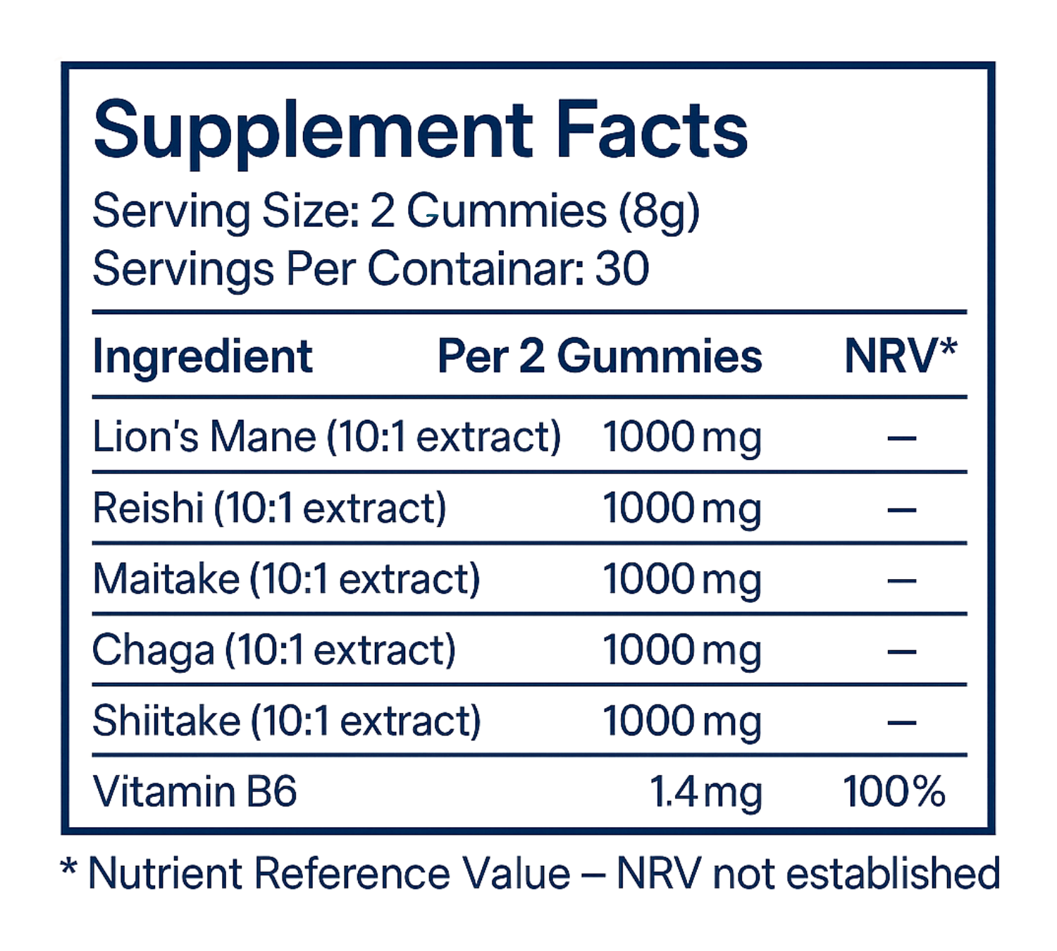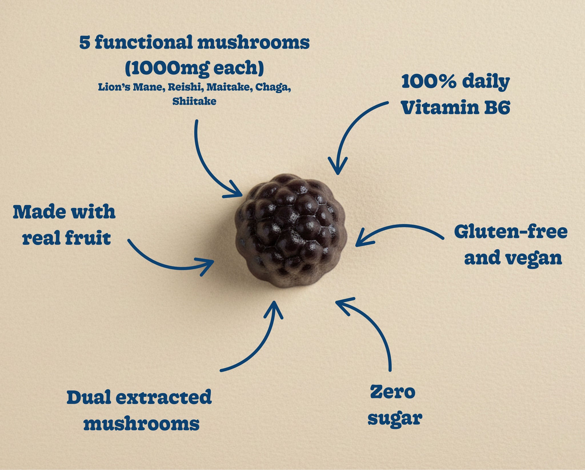 A powerful functional gummy with five functional mushrooms- Lion’s Mane, Reishi, Maitake, Chaga and Shiitake- plus Vitamin B6 to support strength, stamina, and immunity. With zero sugar, real fruit flavour, and a simple two-a-day routine, it’s an easy way to power through the day.